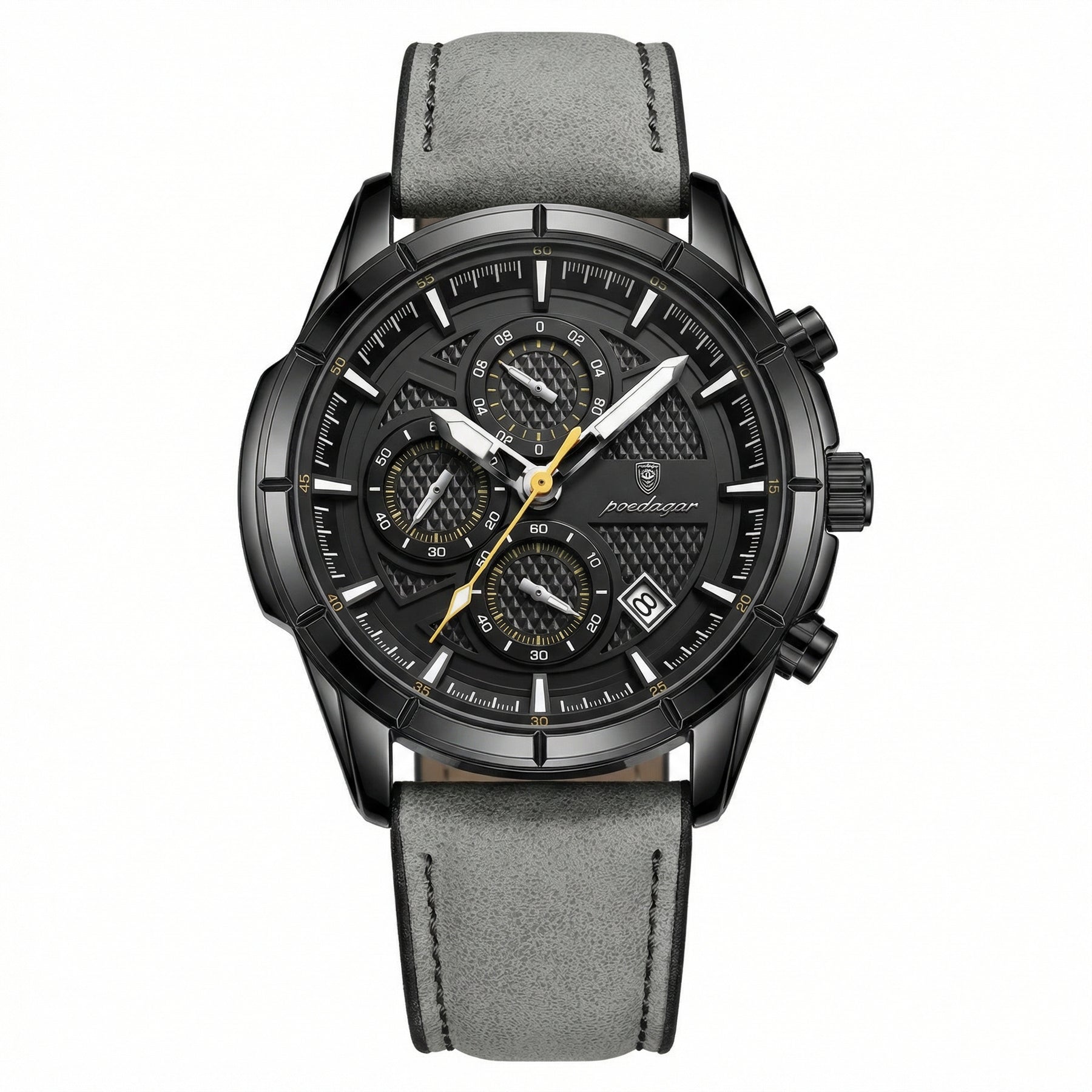 The Eleganto Draven is crafted for men who want a bold, confident presence on their wrist. With its large round case, refined leather strap, and striking chronograph dial with Arabic numeral markers, the Draven delivers a powerful statement that stands out effortlessly. Whether worn daily or for special occasions, it combines classic masculinity with modern precision.