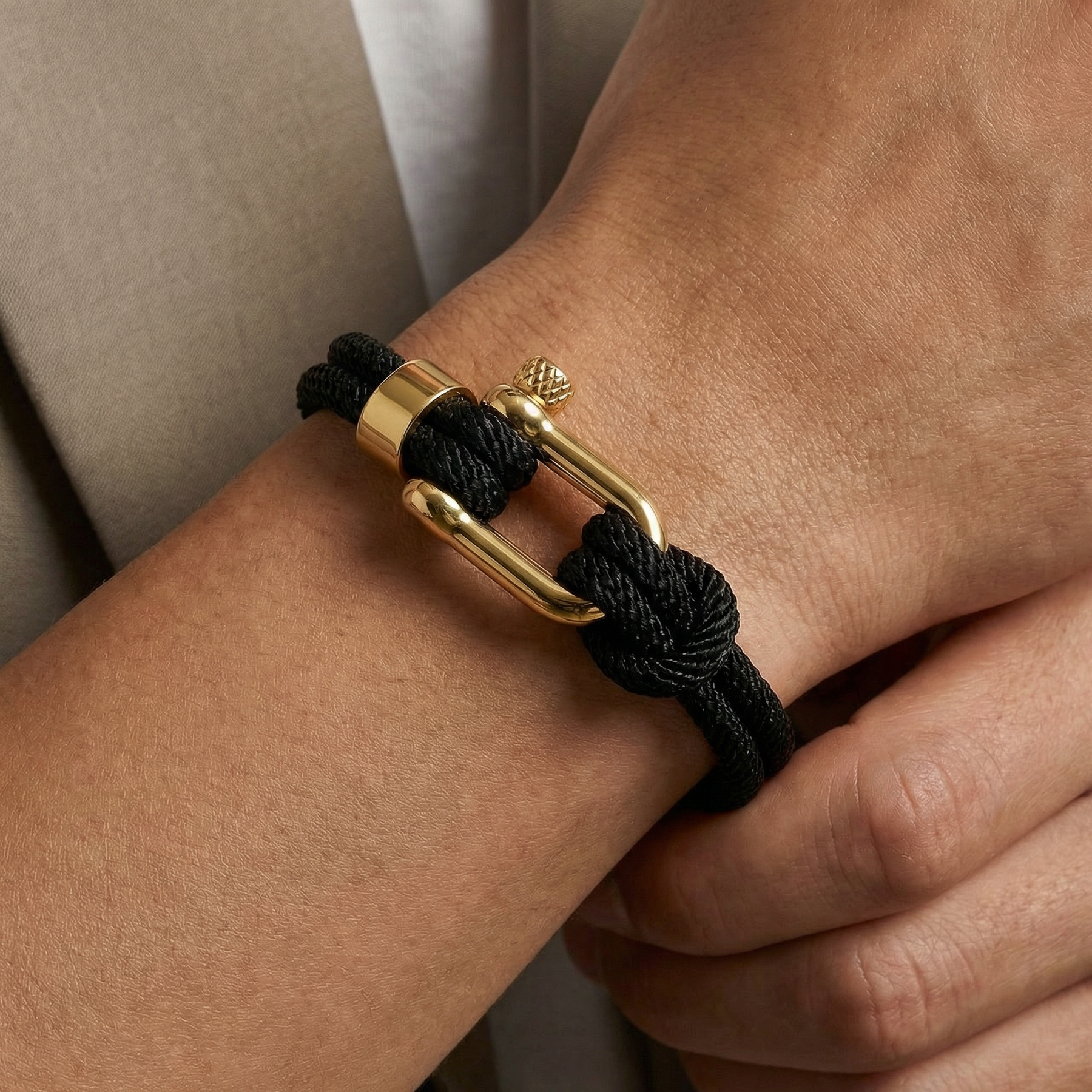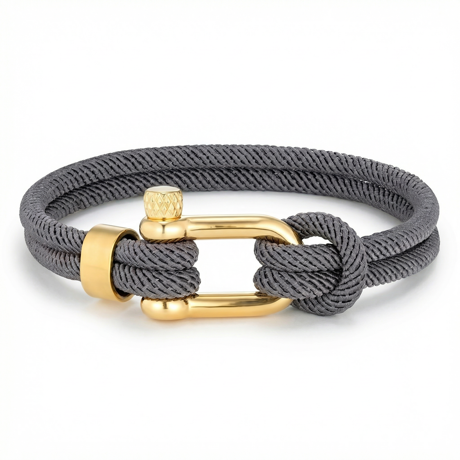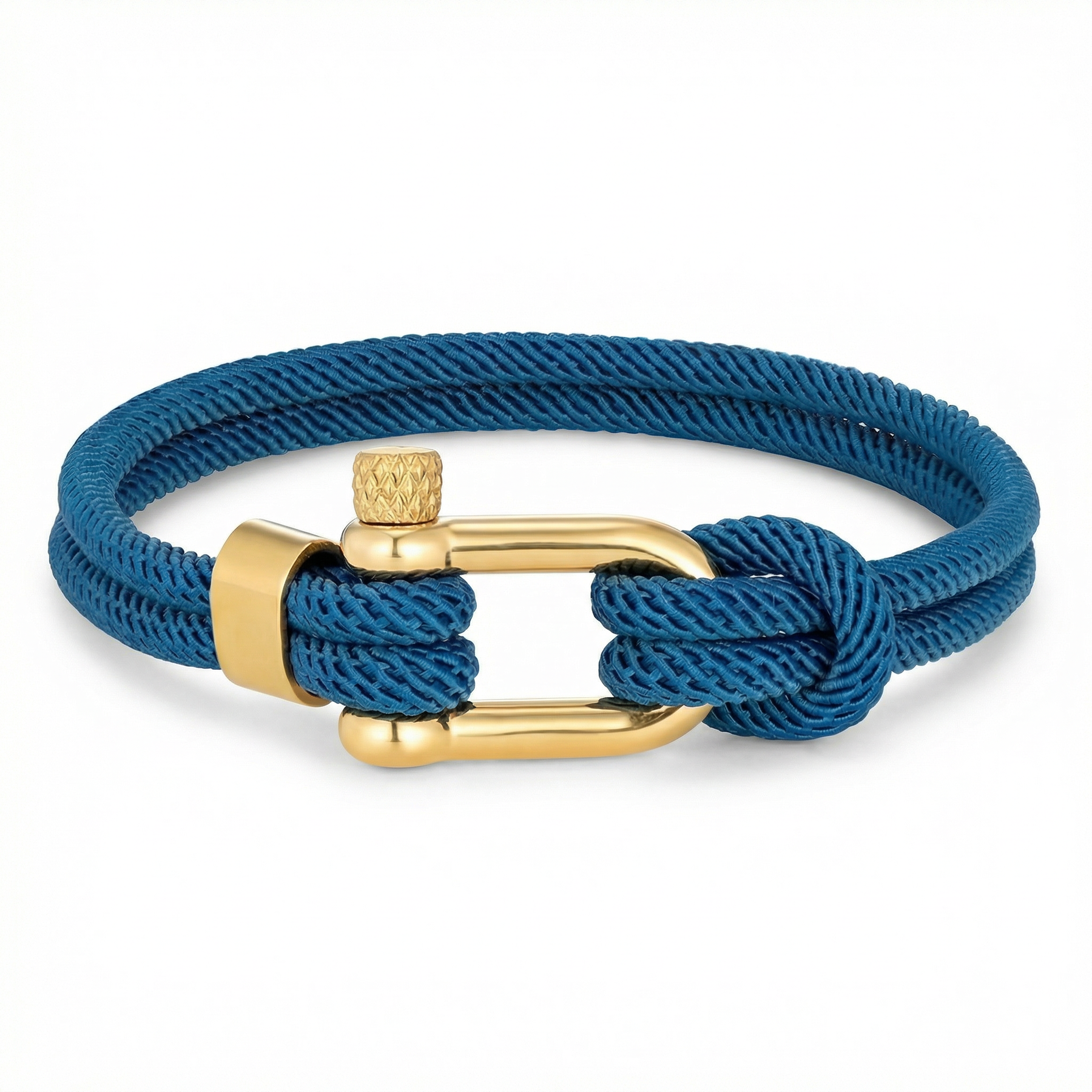 Made from durable, fade-resistant marine-grade nylon cord, this navy double-strand design is carefully hand-knotted around Eleganto’s signature 18k gold-plated shackle clasp, featuring polished hardware for a refined finish.